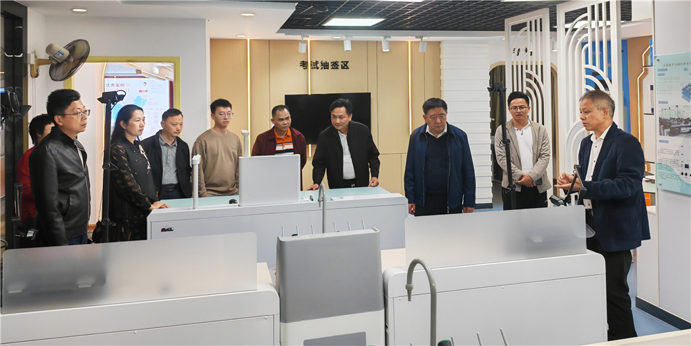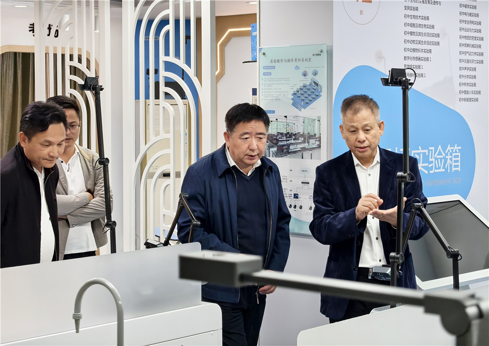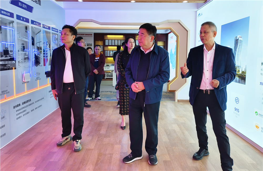 在董事长陈登贵的陪同下,调研组一行走进广视通创新教育装备体验中心,参观了创新智慧实验室、中学AI教考实验室、智慧书法教室、数字地理室等展厅,近距离感受各场景下数字化教育装备的创新应用与实践成果,详细了解广视通的发展历程、经营状况、业务拓展等方面,对公司的经营理念及产品给予了充分肯定,并勉励企业要持续创新,完善人才培养机制,为中小企业的数字化转型发展赋能。