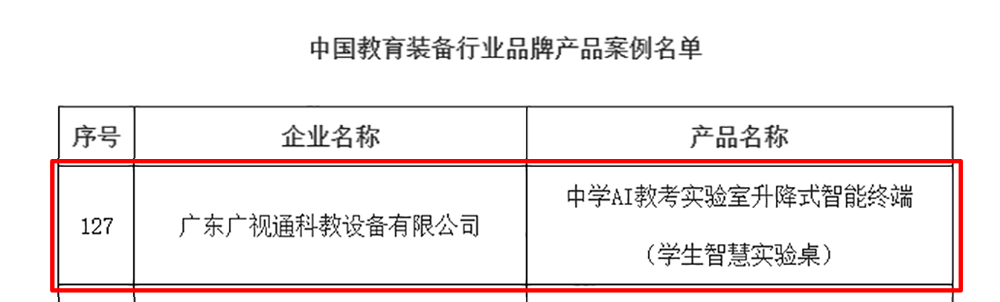 近日,中国教育装备行业协会重磅公示了“中国教育装备行业品牌企业案例名单”与“中国教育装备行业品牌产品案例名单”。广东广视通科教设备有限公司凭借在理化生实验室领域的深厚积淀与创新实力,成功入选品牌企业案例;旗下核心产品——中学AI教考实验室升降式智能终端(学生智慧实验桌)同步斩获品牌产品案例殊荣,实现企业与产品双维度权威认证。
